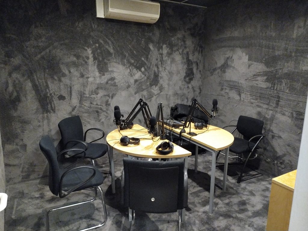 Pour des réalisations dans vos locaux, sur un salon ou ailleurs, nous disposons également d’un studio de podcast mobile : un table de réalisation mobile, 4 micros et 4 casques.